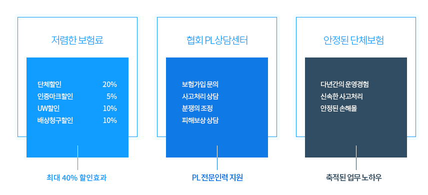 PL단체보험은 협회가 기업체를 대상으로 보험가입자를 모집하고 개별공제계약인수 후 손해보험사와 일괄 단체계약을 체결하는 방식으로 PL(제조물책임) 보험사업을 운영하고 있습니다.